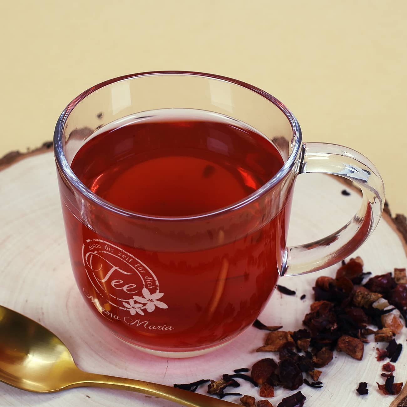 Gönnen Sie sich eine kleine Auszeit mit einer Tasse Tee aus diesem individuellen Glas.