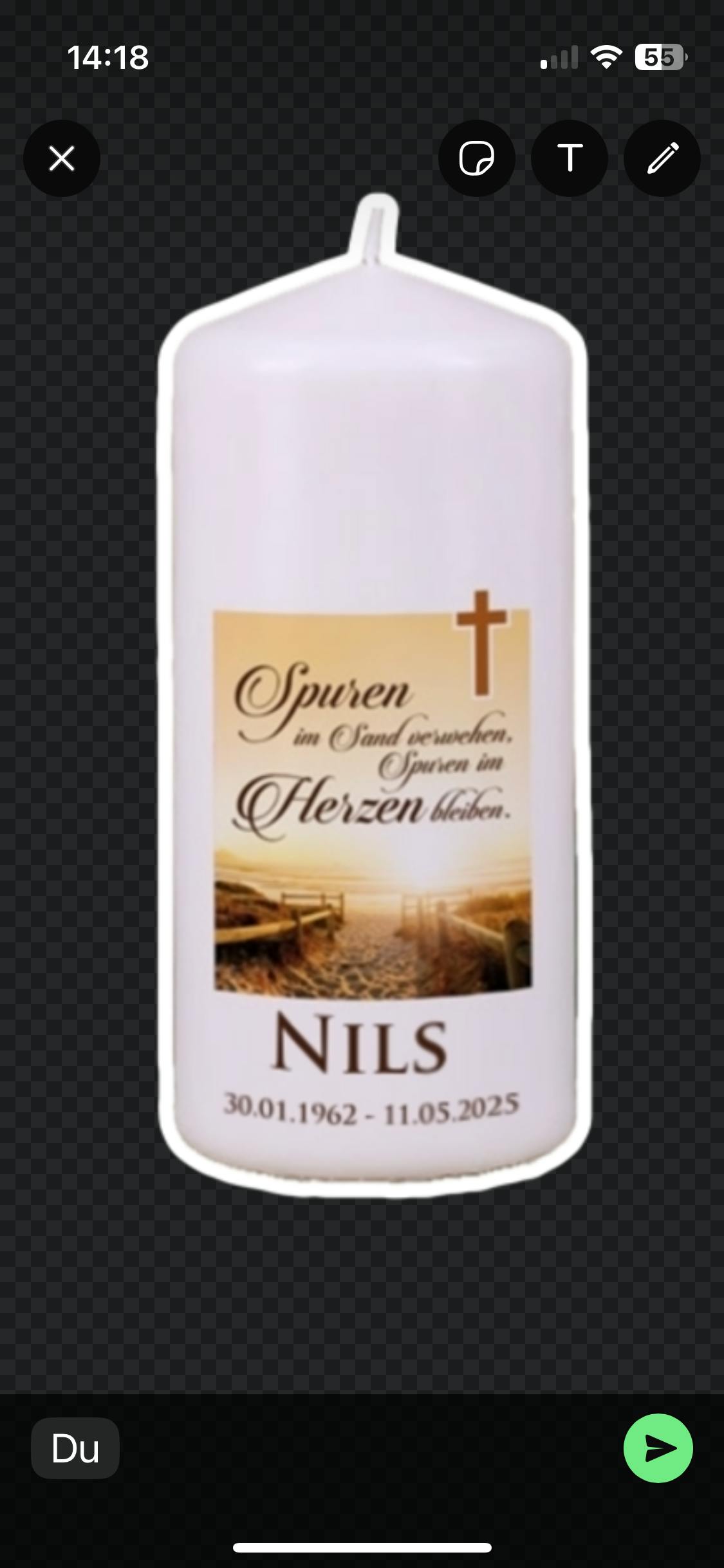 Zünden Sie als Zeichen der Hoffnung und der Verbundenheit mit einem verstorbenen Menschen diese besondere Trauerkerze an. Sie wird mit Name und Datum personalisiert. Darüber ist ein Strandfoto mit folgendem Text abgebildet: Spuren im Sand verwehen, Spuren im Herzen bleiben. Hiermit haben Sie ein schönes Trauergeschenk, welches Ihre Anteilnahme und Beileidbekundungen symbolisiert.