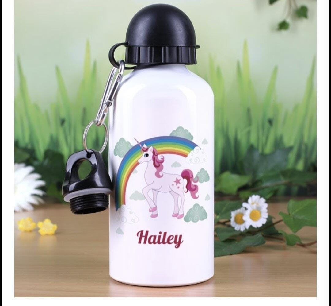 Trinkflasche mit Einhorn, Regenbogen und Name