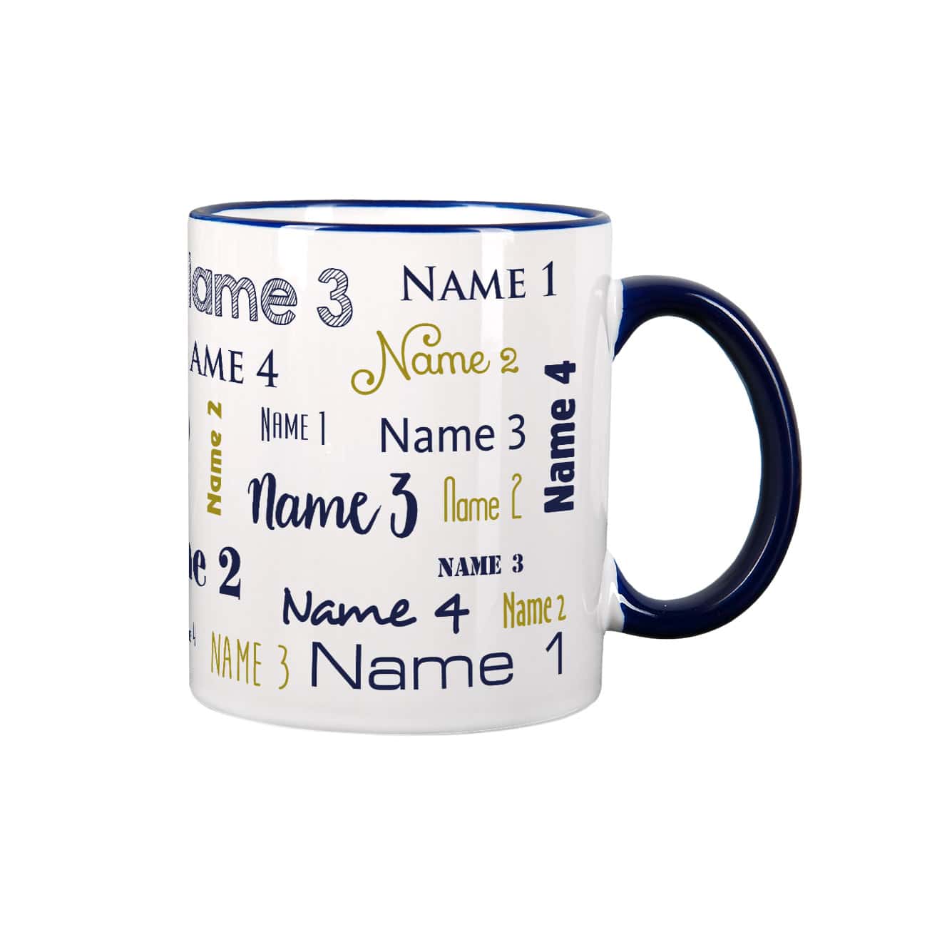 Vier Namen - Familientasse mit dunkelblauem Rand und Henkel