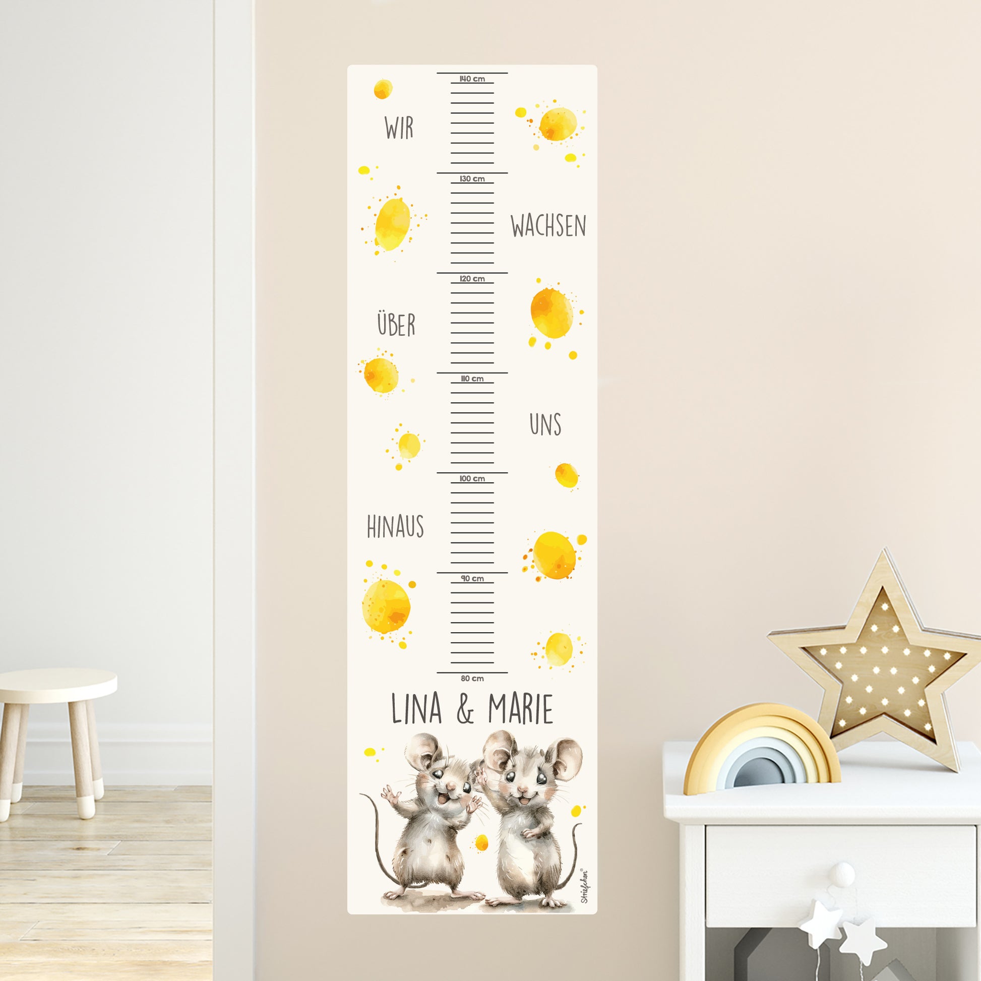 Wandtattoo Messlatte Mäuse-Zwillinge mit Namensaufdruck für Geschwister