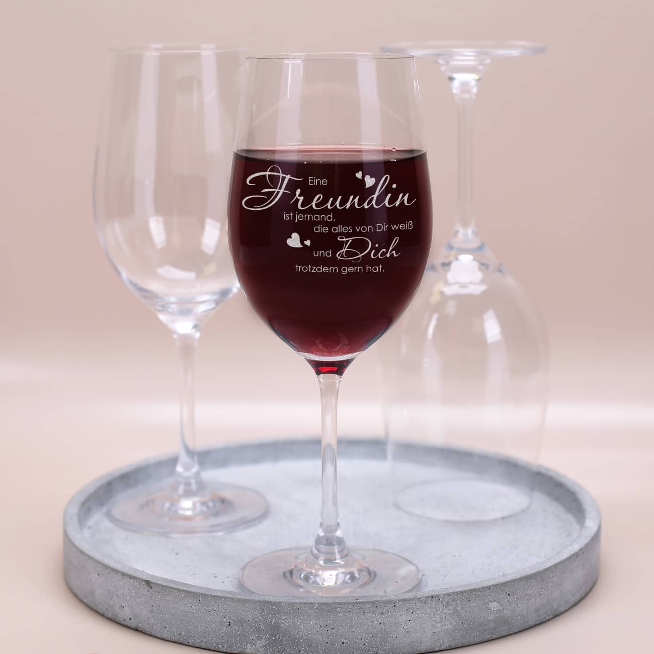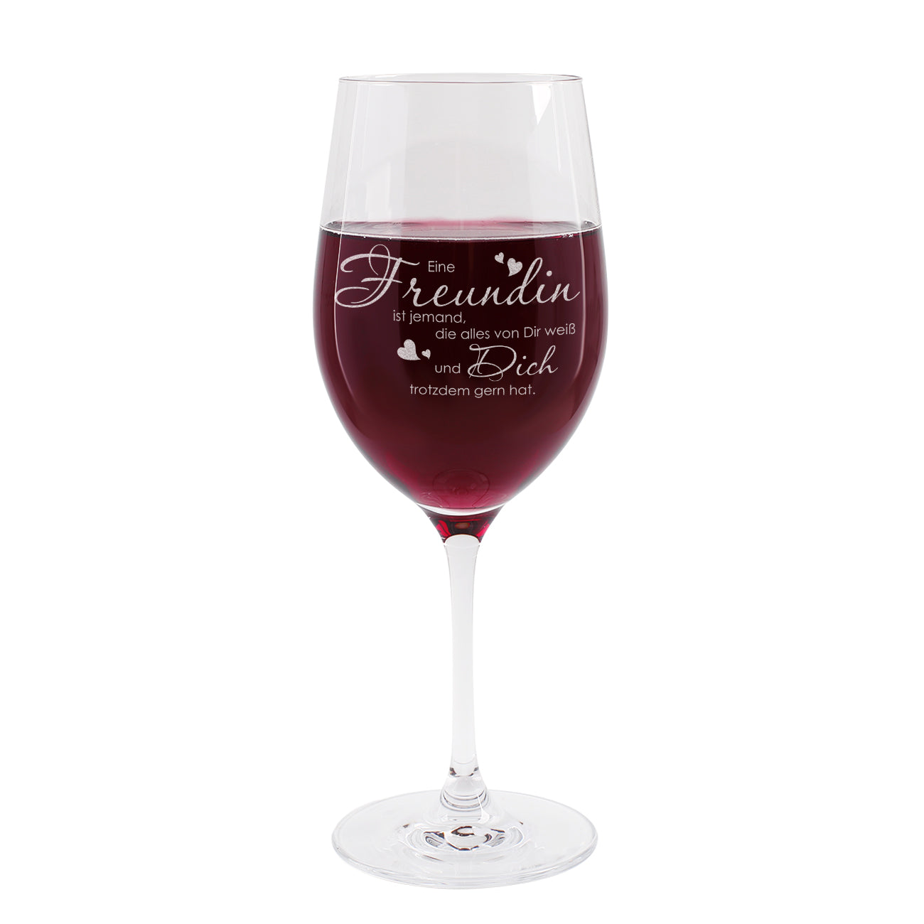 Das Weinglas der Marke Leonardo wird einseitig mit dem tollen Motiv graviert. Der Spruch "Eine Freundin ist jemand, die alles von Dir weiß und Dich trotzdem gern hat." wird durch kleine Herzen abgerundet.