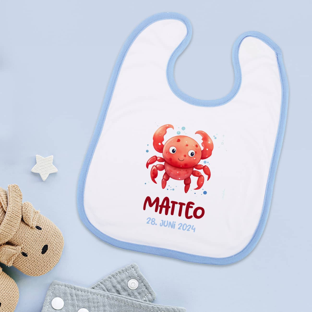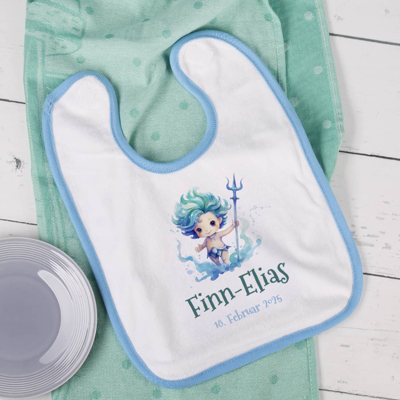 Weiß/blaues Lätzchen mit Sternzeichen, Name und Datum