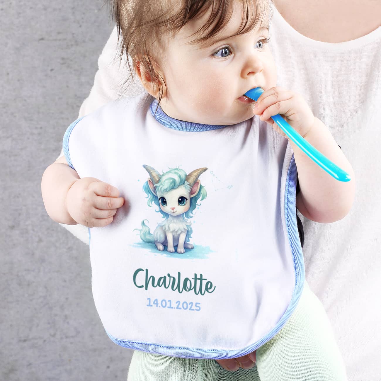 Machen Sie die ersten Jahre eines Kindes noch besonderer mit unserem zauberhaften personalisierbaren Lätzchen. Dieses liebevoll gestaltete Lätzchen ist ein wunderbares Geschenk zur Geburt, Taufe oder zum Geburtstag und vereint praktische Funktion mit niedlichem Design. Unser Lätzchen besticht durch ein süßes, kindlich gestaltetes Sternzeichen, das individuell nach dem Geburtsdatum des Kindes ausgewählt wird. Der Name des Kindes und das Datum können in verschiedenen Schriften und Farben hinzugefügt werden, um eine persönliche Note zu verleihen.