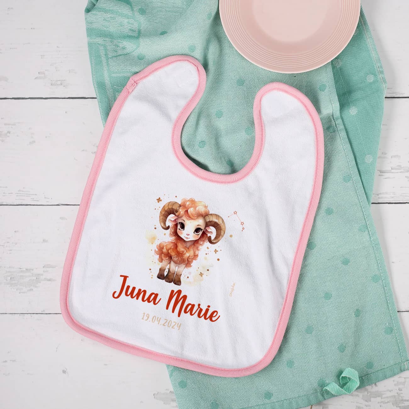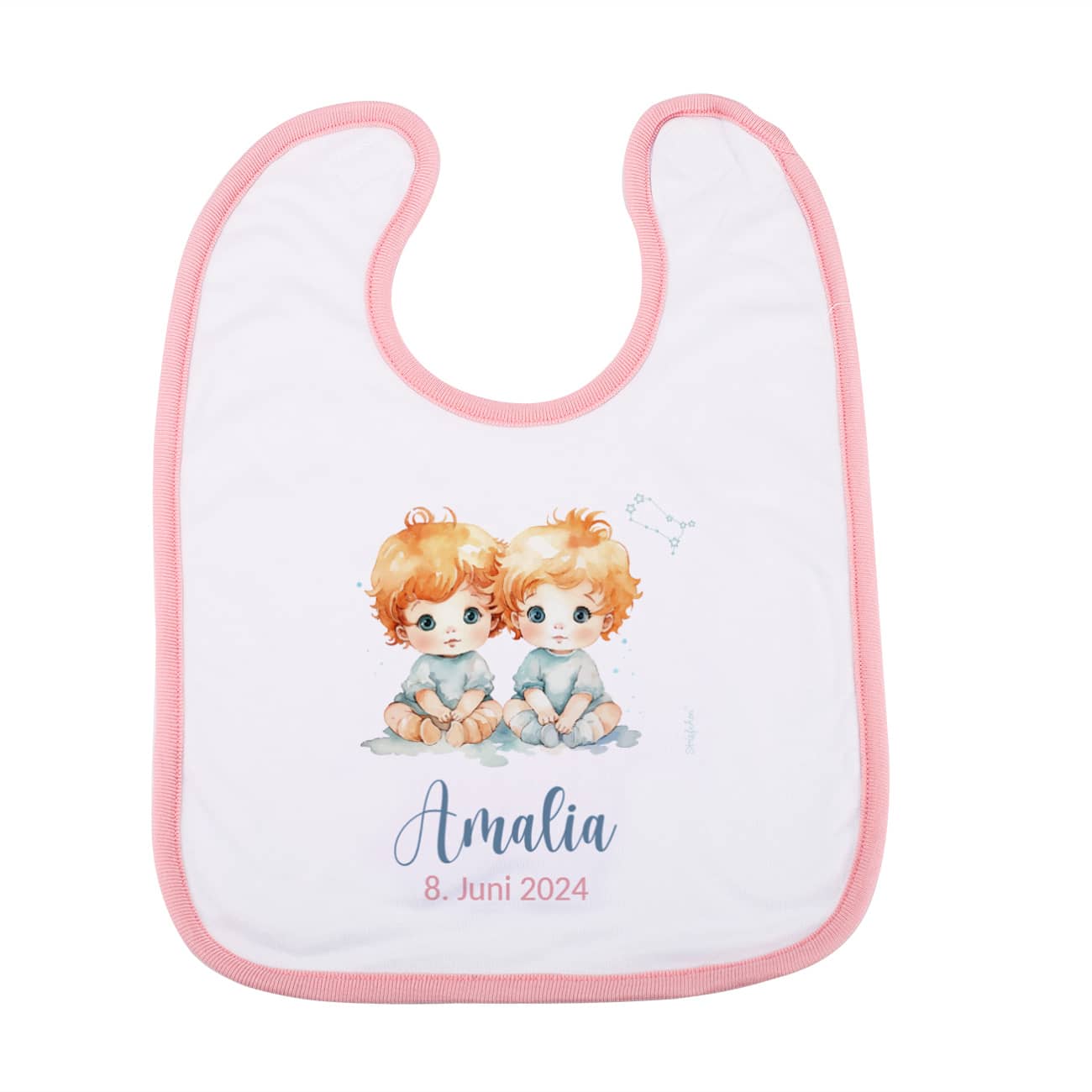 Weiß/rosa Lätzchen mit Sternzeichen, Name und Datum