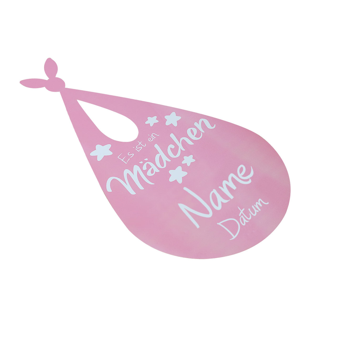 Der rosa Aufkleber wird mit dem Spruch "Es ist ein Mädchen", Sternen, dem Namen und dem Geburtsdatum bedruckt.
